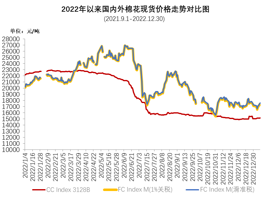 12月,國內疫情防控政策優(yōu)化調整,下游需求復蘇預期提高行業(yè)信心,月中下旬期貨價格持續(xù)反彈,皮棉及棉紗價格小幅跟漲。紡織行業(yè)按慣例應在元旦及春節(jié)前開始備貨,但月初因工人陸續(xù)感染,不能及時復崗,新增訂單增量較少,企業(yè)整體開工率仍顯不足,原料需求隨用隨購,月中下旬逐漸好轉,整體購銷進度略有提升。同期,國際棉價先揚后抑再反彈,月底仍高于國內棉價,內外價差繼續(xù)擴大。