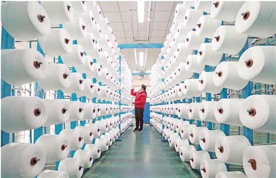 1月30日,工人在晉州市一家紡織企業(yè)生產(chǎn)車間工作。