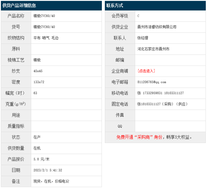 1月31日,晉州浩睿紡織有限公司滌棉平布JCVC60/40 45x45 133x72 63" 噴氣 毛邊,報(bào)價(jià)為5.8元/米,實(shí)際成交價(jià)以協(xié)商為準(zhǔn)。[點(diǎn)擊查看詳情]