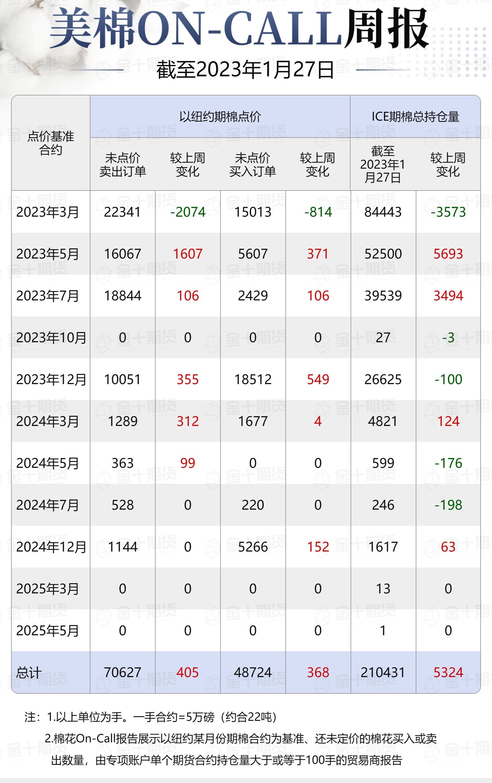 據(jù)美國商品期貨交易委員會(CFTC)最新數(shù)據(jù),截至1月27日,①美棉On-Call未點價賣出訂單70627手,環(huán)比增加405手;未點價買入訂單48724手,環(huán)比增加368手;②ICE期棉2303合約上賣方未點價合約為22341手,較此前一周減少2074手;③ICE期棉2305合約上賣方未點價合約為16067手,較此前一周增加1607手;④ICE期棉2307合約上賣方未點價合約為18844手,較此前一周增加106手;⑤ICE棉花期貨盤面2022/23年度(8月至次年7月)的On-Call合約未點價賣出訂單為57252手,環(huán)比減少361手。