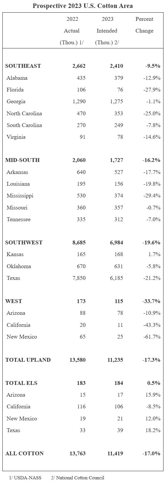 據(jù)美國國家棉花委員會(NCC)第42次年度早期種植意向調(diào)查,美國棉花生產(chǎn)商計劃今年春季種植1141.9萬英畝棉花,比2022年減少17%。陸地棉意向1123.5萬英畝,比2022年減少17.3%,超長纖維棉(ELS)種植意向18.4萬英畝,增長0.5%。