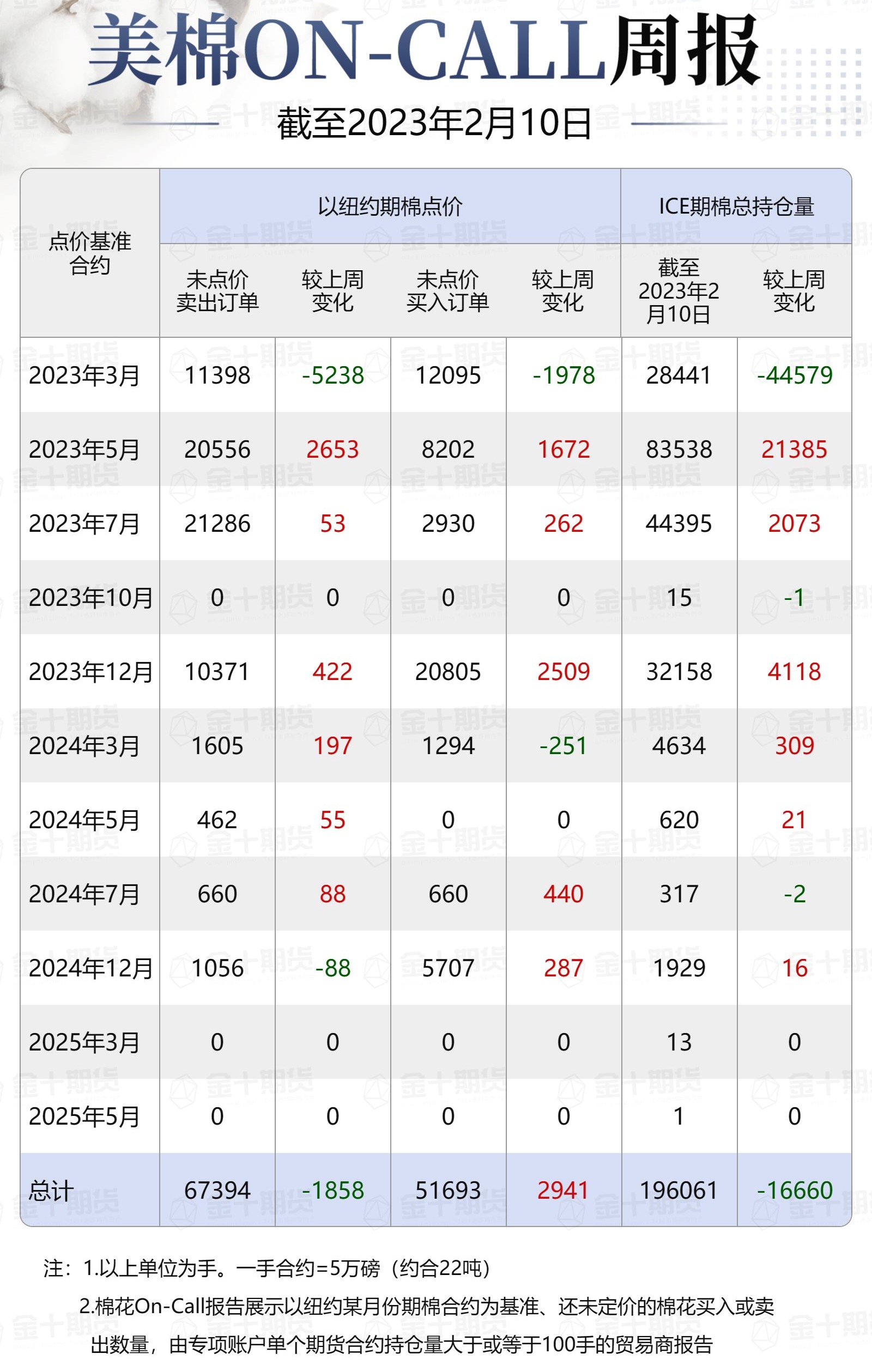 據(jù)美國商品期貨交易委員會(huì)(CFTC)最新數(shù)據(jù),截至2月10日,①美棉On-Call未點(diǎn)價(jià)賣出訂單67394手,環(huán)比減少1858手;未點(diǎn)價(jià)買入訂單51693手,環(huán)比增加2941手;②ICE期棉2303合約上賣方未點(diǎn)價(jià)合約為11398手,較此前一周減少5238手;③ICE期棉2305合約上賣方未點(diǎn)價(jià)合約為20556手,較此前一周增加2653手;④ICE期棉2307合約上賣方未點(diǎn)價(jià)合約為21286手,較此前一周增加53手;⑤ICE棉花期貨盤面2022/23年度(8月至次年7月)的On-Call合約未點(diǎn)價(jià)賣出訂單為53240手,環(huán)比減少2532手。