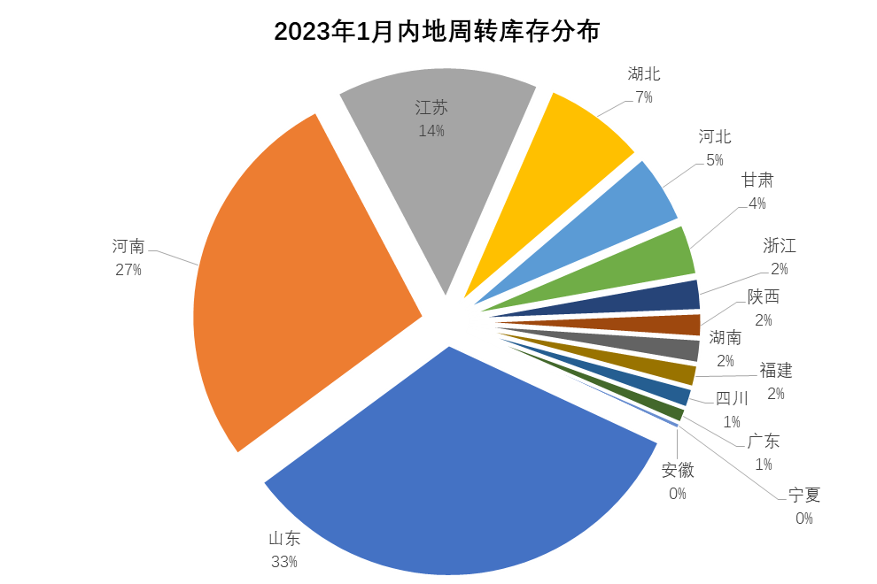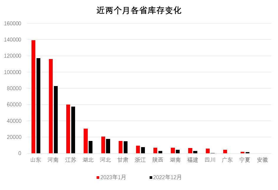 分省份看,山東省庫存量居首位13.94萬噸,河南省次之11.61萬噸,江蘇省居第三位6.03萬噸,湖北省3.05萬噸,河北省2.06萬噸,甘肅省1.52,其他省均在1萬噸以下。