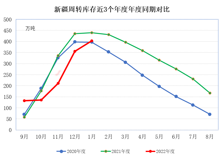 截至1月底,新疆43家倉庫商品棉周轉(zhuǎn)庫存為403.05萬噸,環(huán)比增加47.27萬噸,增幅環(huán)比大幅縮??;同比減少36.76萬噸。