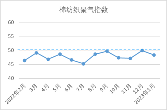 說(shuō)明:中國(guó)棉紡織行業(yè)景氣指數(shù)采集自全國(guó)近500家次棉紡織廠,參考國(guó)家制造業(yè)PMI等指數(shù)制定方式,通過(guò)對(duì)多個(gè)主要指標(biāo)加權(quán)計(jì)算得出,當(dāng)指數(shù)高于50,表示棉紡織行業(yè)本月景氣程度好于上月,低于50則表示本月景氣程度不及上月。
