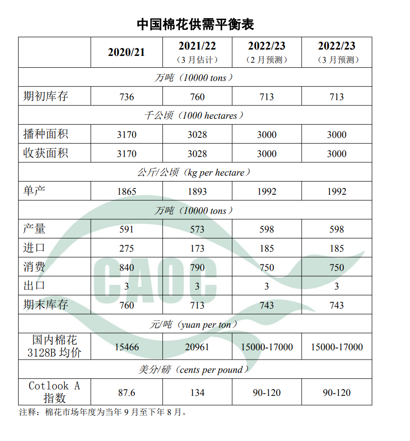本月對(duì)2022/23年度預(yù)測(cè)數(shù)據(jù)不作調(diào)整。國(guó)內(nèi)經(jīng)濟(jì)穩(wěn)步復(fù)蘇,下游紡織品服裝消費(fèi)預(yù)期增強(qiáng),棉花銷(xiāo)售進(jìn)度明顯加快。據(jù)國(guó)家棉花市場(chǎng)監(jiān)測(cè)系統(tǒng)數(shù)據(jù),截至3月2日,全國(guó)新棉銷(xiāo)售率為53.0%,同比提高13.7個(gè)百分點(diǎn)??紤]到棉花供應(yīng)總體充足,“金三銀四”消費(fèi)回暖情況有待觀察,棉價(jià)暫維持上月預(yù)測(cè)值不變。