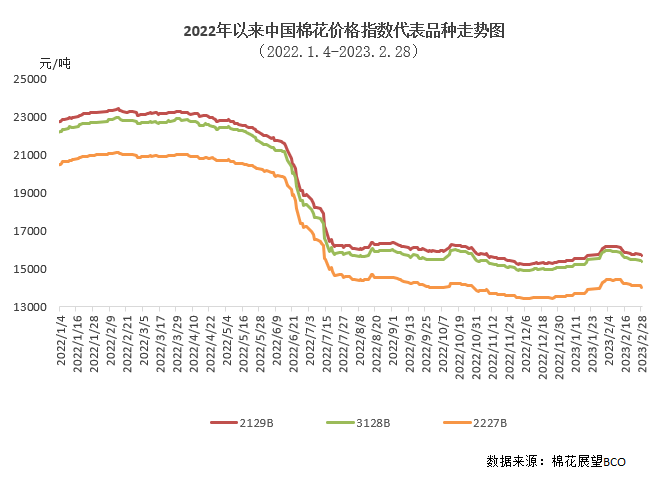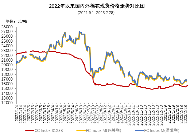 2月,因通脹壓力引發(fā)經(jīng)濟(jì)衰退擔(dān)憂、美聯(lián)儲加息預(yù)期增強(qiáng),國際棉價震蕩下跌。中國進(jìn)口棉價格指數(shù)FCIndexM月均99.21美分/磅,環(huán)比下跌0.35美分;月底99.72美分/磅,環(huán)比下跌0.72美分,1%關(guān)稅下折人民幣16562元/噸,高于同期國內(nèi)現(xiàn)貨1172元,內(nèi)外棉價價差較上月收窄100元左右。