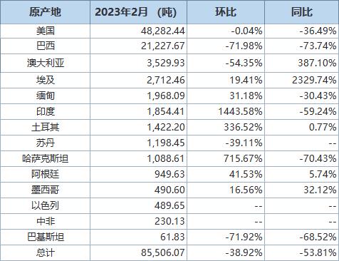 2023年2月我國進(jìn)口棉花約9萬噸,環(huán)比減少約5萬噸,同比下降約53.8%。