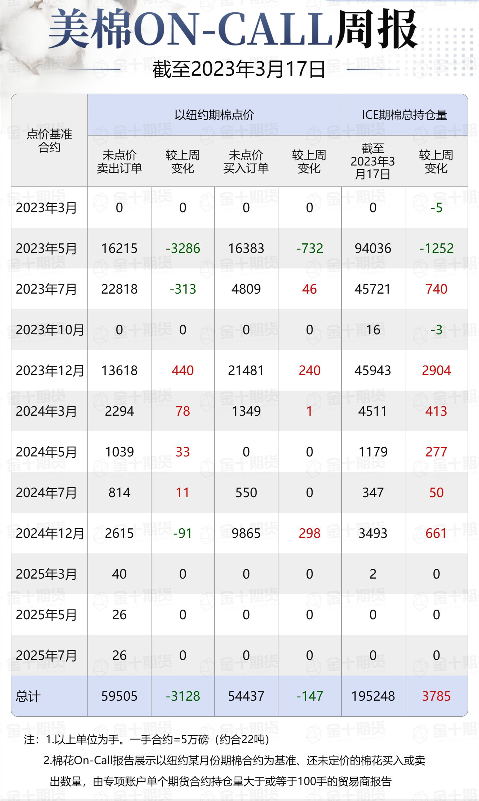 據(jù)美國(guó)商品期貨交易委員會(huì)(CFTC)最新數(shù)據(jù),截至3月17日,①美棉On-Call未點(diǎn)價(jià)賣出訂單59505手,環(huán)比減少3128手;未點(diǎn)價(jià)買入訂單54437手,環(huán)比減少147手;②ICE期棉2303合約上賣方未點(diǎn)價(jià)合約為0手,較此前一周增加0手;③ICE期棉2305合約上賣方未點(diǎn)價(jià)合約為16215手,較此前一周減少3286手;④ICE期棉2307合約上賣方未點(diǎn)價(jià)合約為22818手,較此前一周減少313手;⑤ICE棉花期貨盤面2022/23年度(8月至次年7月)的On-Call合約未點(diǎn)價(jià)賣出訂單為39033手,環(huán)比減少3599手。