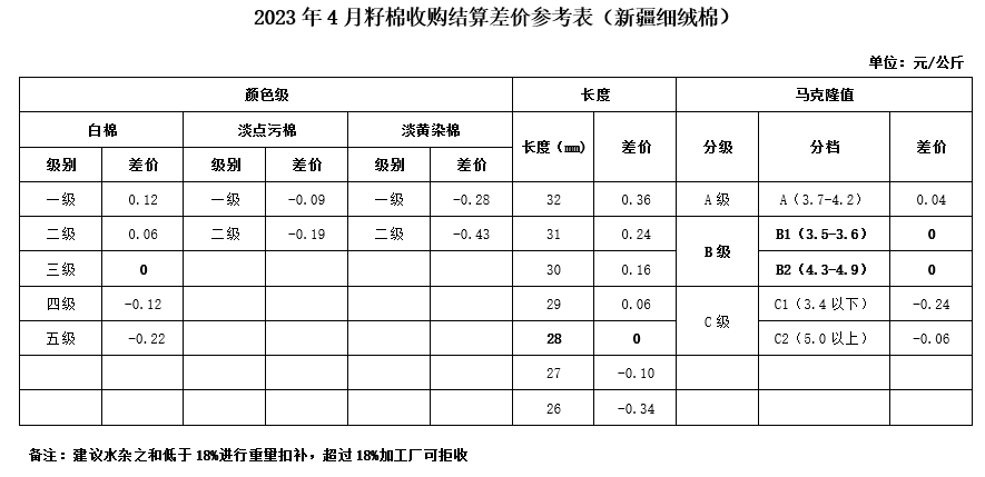 依據(jù)中國棉花協(xié)會發(fā)布的2023年4月《鋸齒加工細(xì)絨棉質(zhì)量差價(jià)表》和中國棉花預(yù)警系統(tǒng)2022年9月-2023年1月新疆籽棉收購平均衣分率數(shù)據(jù),折算得出籽棉收購差價(jià),現(xiàn)正式發(fā)布2023年4月《籽棉收購結(jié)算差價(jià)參考表(新疆細(xì)絨棉)》(單位:元/公斤),為新疆地區(qū)籽棉收購工作提供參考。