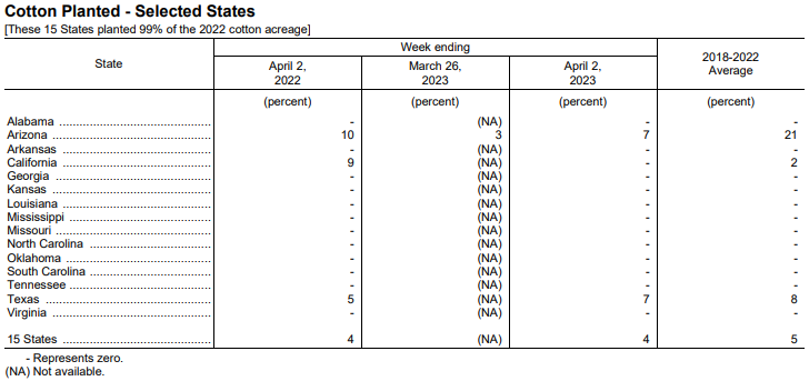 美國農業(yè)部4月3日發(fā)布的美國棉花生長報告顯示,截至4月2日當周,美棉種植率為4%,去年同期為4%,五年均值為5%。