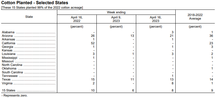 美國農(nóng)業(yè)部4月17日發(fā)布的美國棉花生長報(bào)告顯示,截至4月16日當(dāng)周,美棉種植率為8%,前周為6%,去年同期為10%,五年均值為9%。