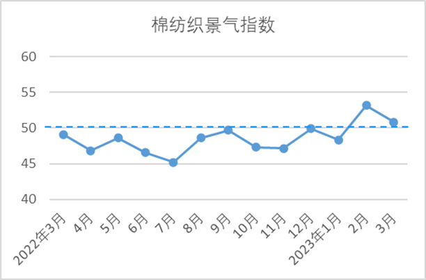 說明:中國棉紡織行業(yè)景氣指數(shù)采集自全國近500家次棉紡織企業(yè),參考國家制造業(yè)PMI等指數(shù)制定方式,通過對多個主要指標(biāo)加權(quán)計算得出,當(dāng)指數(shù)高于50,表示棉紡織行業(yè)本月景氣程度好于上月,低于50則表示本月景氣程度不及上月。