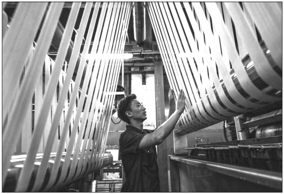 2023年5月8日,浙江省蘭溪市,浙江鑫蘭紡織有限公司牛仔面料自動(dòng)化生產(chǎn)線旁,工人在認(rèn)真巡檢。今年1季度,浙江省蘭溪市161家規(guī)上紡織產(chǎn)業(yè)企業(yè)實(shí)現(xiàn)工業(yè)總產(chǎn)值62.58億元;稅收總額15602.8萬(wàn)元,同比增長(zhǎng)67.8%,增速比規(guī)上工業(yè)稅收總額增速高58.8個(gè)百分點(diǎn)。紡織行業(yè)固定資產(chǎn)投資4.21億元,同比增長(zhǎng)55.5%,增速比全市固定資產(chǎn)投資增速高33.8個(gè)百分點(diǎn)。