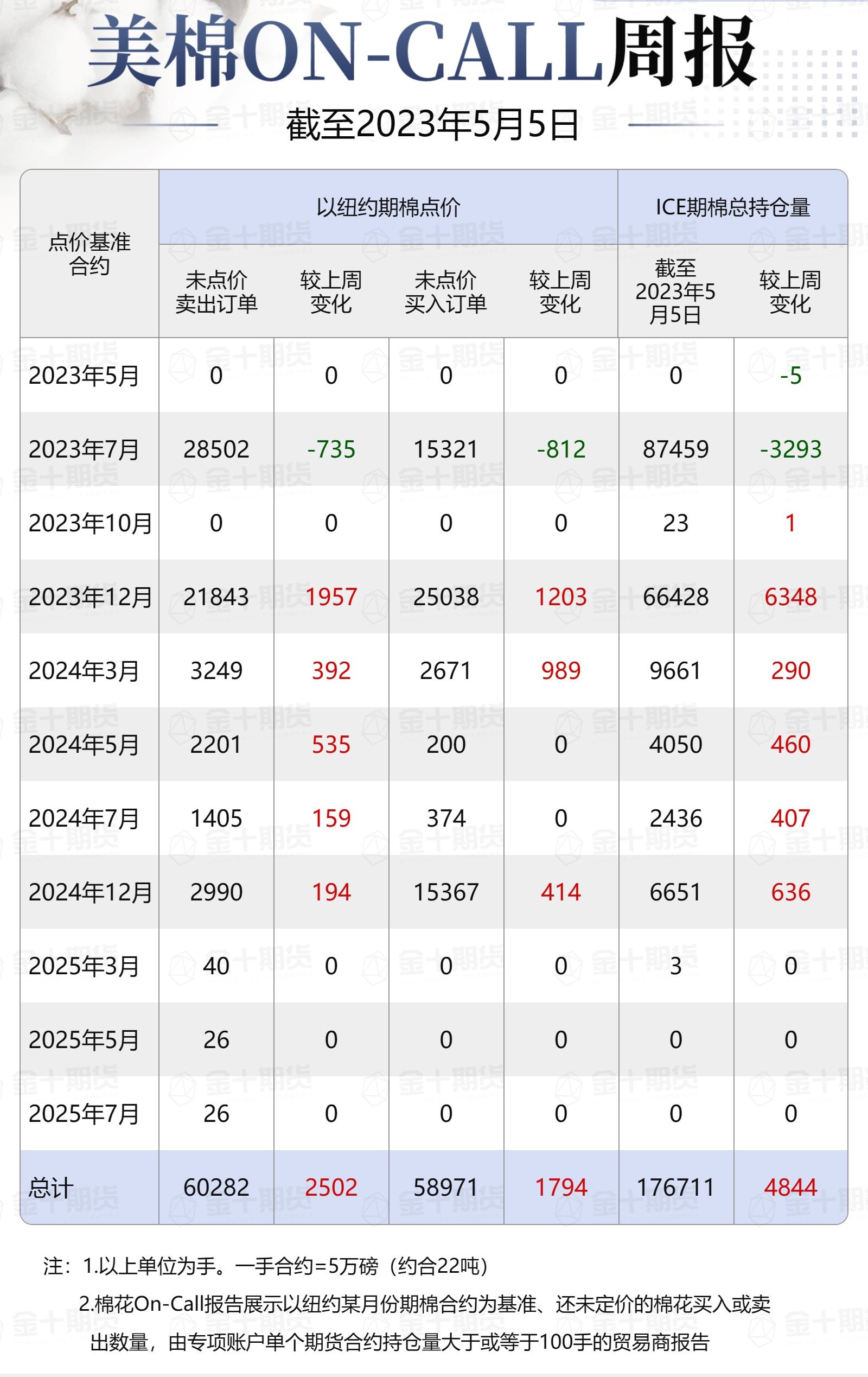 據(jù)美國商品期貨交易委員會(huì)(CFTC)最新數(shù)據(jù),截至5月5日,①美棉On-Call未點(diǎn)價(jià)賣出訂單60282手,環(huán)比增加2502手;未點(diǎn)價(jià)買入訂單58971手,環(huán)比增加1794手;②ICE期棉2305合約上賣方未點(diǎn)價(jià)合約為0手,較此前一周增加0手;③ICE期棉2307合約上賣方未點(diǎn)價(jià)合約為28502手,較此前一周減少735手;④ICE棉花期貨盤面2022/23年度(8月至次年7月)的On-Call合約未點(diǎn)價(jià)賣出訂單為28502手,環(huán)比減少735手。