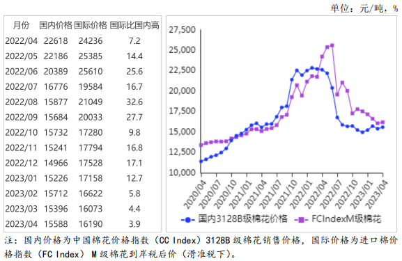 (二)國際棉價繼續(xù)下跌。本月,美歐銀行業(yè)危機引發(fā)市場對全球經(jīng)濟前景的擔憂,疊加美國農業(yè)部(USDA)調減全球棉花消費量、調增全球棉花產量等因素影響,國際棉價下跌。4月CotlookA指數(shù)(相當于國內3128B級棉花)月均價每磅95.16美分,環(huán)比跌0.1%,同比跌38.5%。