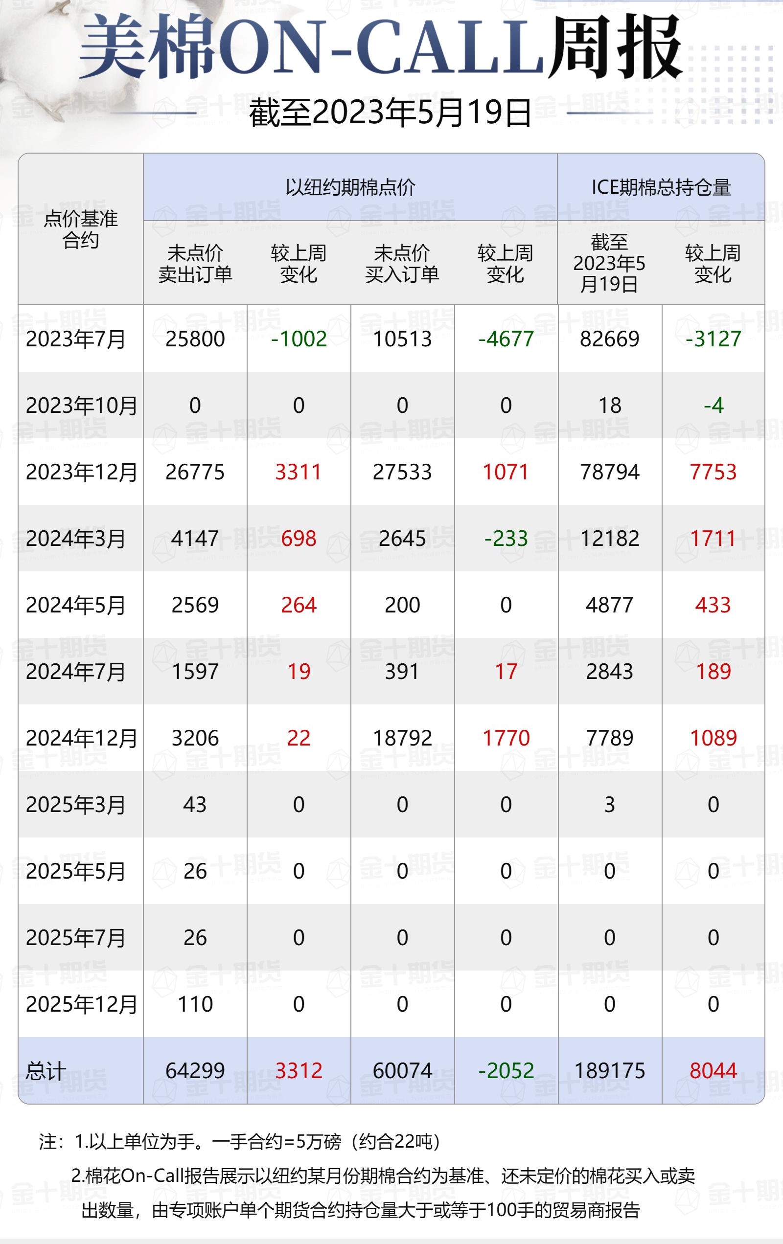 據(jù)美國商品期貨交易委員會(CFTC)最新數(shù)據(jù),截至5月19日,①美棉On-Call未點價賣出訂單64299手,環(huán)比增加3312手;未點價買入訂單60074手,環(huán)比減少2052手;②ICE期棉2307合約上賣方未點價合約為25800手,較此前一周減少1002手;③ICE棉花期貨盤面2022/23年度(8月至次年7月)的On-Call合約未點價賣出訂單為25800手,環(huán)比減少1002手。