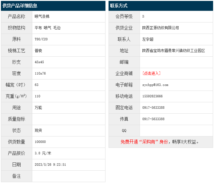 5月26日,陜西芷源紡織有限公司滌棉平布T80/C20 45x45 110x76 63" 110g/㎡ 噴氣 毛邊,報價為3.8元/米,實(shí)際成交價以協(xié)商為準(zhǔn)。[點(diǎn)擊查看詳情]