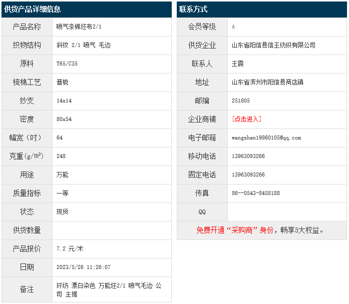 5月26日,山東陽信縣信王紡織有限公司滌棉斜紋T65/C35 14x14 80x54 64" 2/1 248g/㎡ 噴氣 毛邊,報價為7.2元/米,實際成交價以協(xié)商為準。[點擊查看詳情]