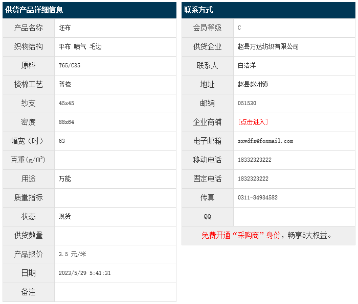 5月28日,趙縣萬達紡織有限公司滌棉平布T65/C35 45x45 88x64 63" 噴氣 毛邊,報價為3.5元/米,實際成交價以協(xié)商為準。[點擊查看詳情]