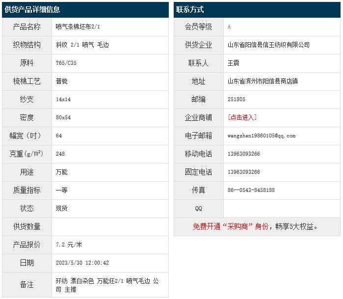 5月30日,山東陽(yáng)信縣信王紡織有限公司滌棉斜紋T65/C35 14x14 80x54 64" 2/1 248g/㎡ 噴氣 毛邊,報(bào)價(jià)為7.2元/米,實(shí)際成交價(jià)以協(xié)商為準(zhǔn)。[點(diǎn)擊查看詳情]
