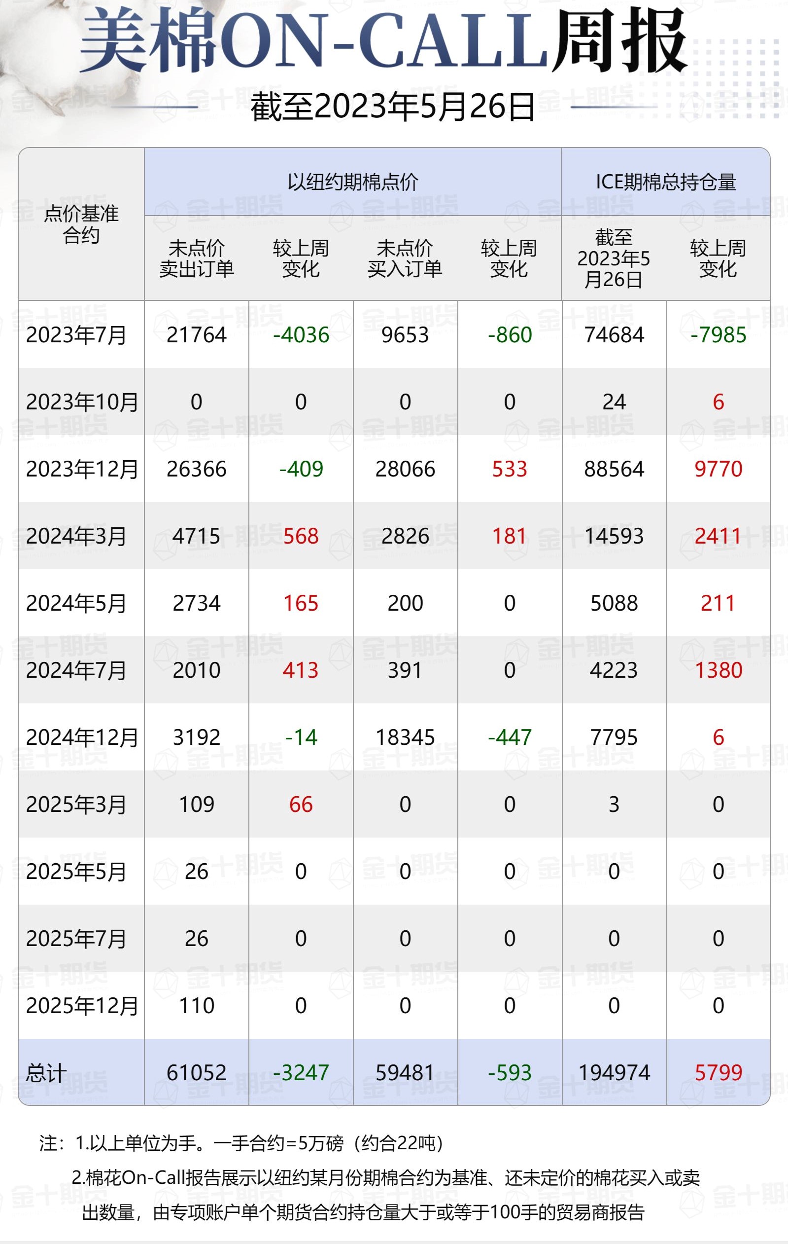 據(jù)美國(guó)商品期貨交易委員會(huì)(CFTC)最新數(shù)據(jù),截至5月26日,①美棉ON-call未點(diǎn)價(jià)賣出訂單61052手,環(huán)比減少3247手;未點(diǎn)價(jià)買入訂單59481手,環(huán)比減少593手;②ICE期棉2307合約上賣方未點(diǎn)價(jià)合約為21764手,較此前一周減少4036手;③ICE棉花期貨盤面2022/23年度(8月至次年7月)的ON-CAll合約未點(diǎn)價(jià)賣出訂單為21764手,環(huán)比減少4036手。