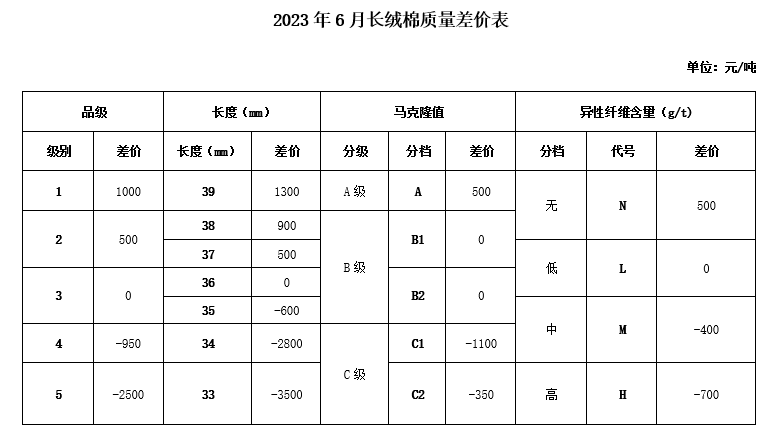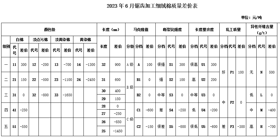 根據《中國棉花協會國產棉質量差價表管理辦法》規(guī)定,現正式發(fā)布2023年6月《鋸齒加工細絨棉質量差價表》、《皮輥加工細絨棉質量差價表》和《長絨棉質量差價表》(單位:元/噸)。