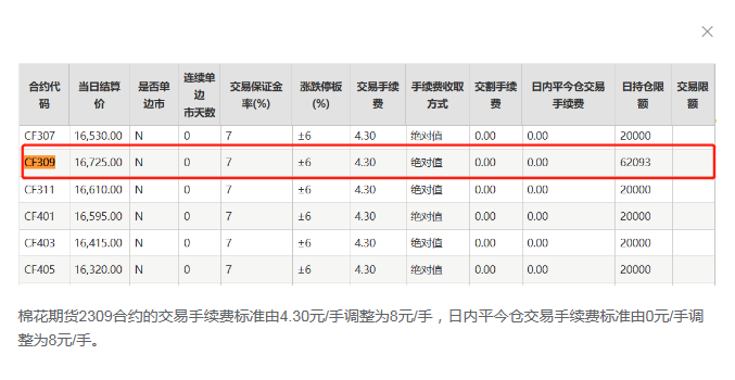 根據(jù)《鄭州商品交易所期貨結(jié)算管理辦法》第二十七條規(guī)定,經(jīng)研究決定,自2023年6月6日當(dāng)晚夜盤交易時(shí)起,棉花期貨2309合約的交易手續(xù)費(fèi)標(biāo)準(zhǔn)調(diào)整為8元/手,日內(nèi)平今倉(cāng)交易手續(xù)費(fèi)標(biāo)準(zhǔn)調(diào)整為8元/手。