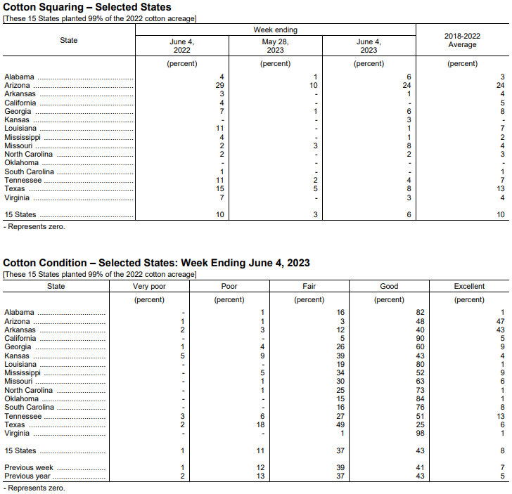 美國農(nóng)業(yè)部6月5日發(fā)布的美國棉花生長報(bào)告顯示,截至6月4日當(dāng)周,美棉種植率為71%,前周為60%,去年同期為82%,五年均值為75%。美棉現(xiàn)蕾率為6%,前周為3%,去年同期為10%,五年均值為10%。美棉生長優(yōu)良率為51%,前周為48%,去年同期為48%。