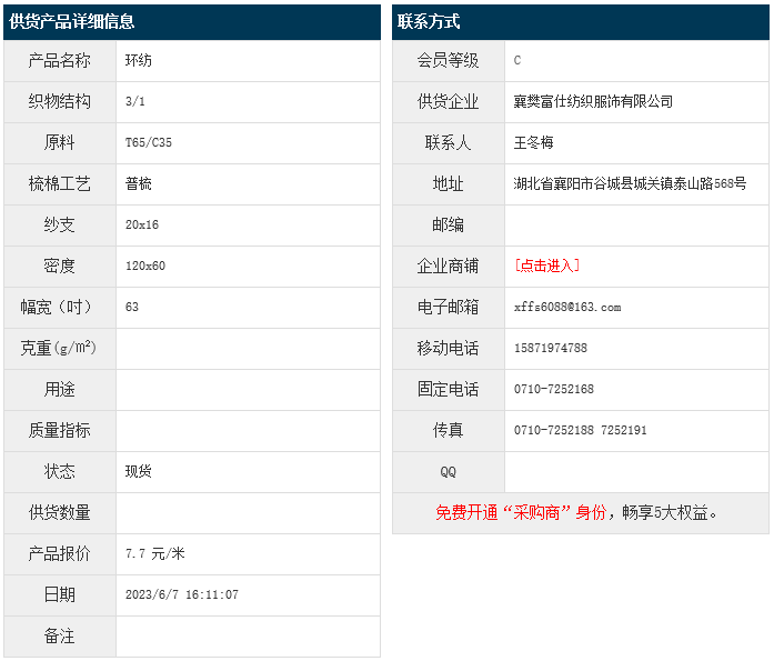 6月7日,襄樊富仕紡織服飾有限公司滌棉布T65/C35 20x16 120x60 63" 3/1,報價為7.7元/米,實際成交價以協(xié)商為準。[點擊查看詳情]