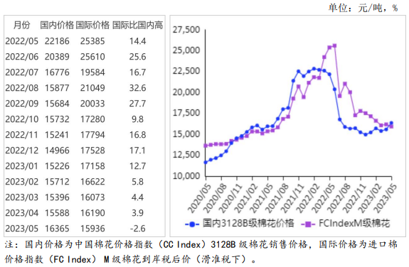 (一)國內(nèi)棉價(jià)環(huán)比上漲,同比下跌。棉花原料采購活躍,國內(nèi)棉價(jià)有所上漲。5月,國內(nèi)3128B級(jí)棉花月均價(jià)每噸16365元,環(huán)比漲5.0%,同比跌26.2%。鄭棉期貨主力合約(CF309)月結(jié)算價(jià)每噸15739元,環(huán)比漲3.0%,同比跌25.8%。
