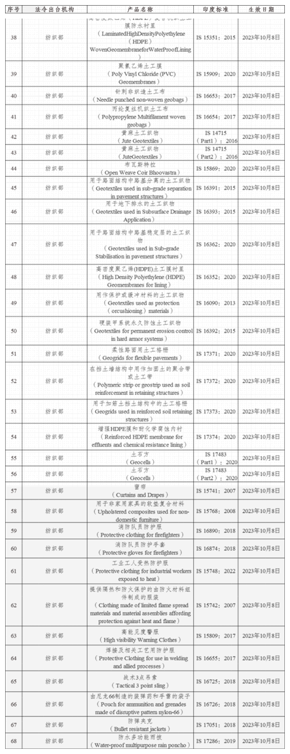 近日,印度標(biāo)準(zhǔn)局(BIS)公布由紡織部等部門發(fā)布的93類產(chǎn)品質(zhì)量控制令的生效日期。被納入質(zhì)量控制令的產(chǎn)品將必須符合相關(guān)印度標(biāo)準(zhǔn),且經(jīng)印度標(biāo)準(zhǔn)局認(rèn)證后加貼標(biāo)準(zhǔn)標(biāo)志,否則不得生產(chǎn)、銷售、交易、進(jìn)口或儲存。相關(guān)情況如下表所示。