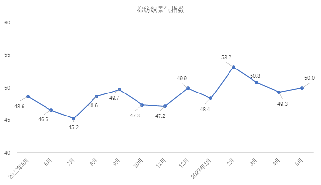 說明:中國棉紡織行業(yè)景氣指數(shù)采集自全國近500家次棉紡織廠,參考國家制造業(yè)PMI等指數(shù)制定方式,通過對多個主要指標(biāo)加權(quán)計算得出,當(dāng)指數(shù)高于50,表示棉紡織行業(yè)本月景氣程度好于上月,低于50則表示本月景氣程度不及上月。