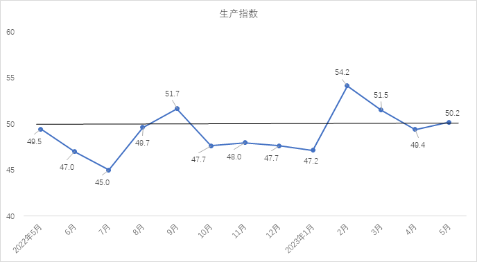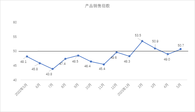 5月,生產(chǎn)指數(shù)為50.2,較4月上升0.8,位于擴(kuò)張區(qū)間,表明企業(yè)生產(chǎn)形勢向好。當(dāng)月,多數(shù)企業(yè)維持滿負(fù)荷生產(chǎn),員工流動性較低,產(chǎn)品產(chǎn)量環(huán)比上升。從分項指數(shù)看,棉紡織廠設(shè)備開臺率指數(shù)50.0,與4月持平。紗產(chǎn)量指數(shù)50.2,較4月上升1.0,布產(chǎn)量指數(shù)50.7,較4月上升2.3。