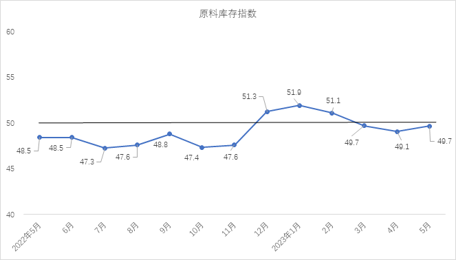 5月,原料庫存指數(shù)為49.7,較4月上升0.6,棉紡織廠原料庫存降幅有所收窄。當(dāng)月受天氣炒作影響,棉價上漲,棉紡織廠理性看待市場波動,做好風(fēng)險防控。非棉纖維方面,企業(yè)根據(jù)訂單和市場價格合理把控,及時補(bǔ)充庫存。從分項指數(shù)看,棉花庫存量指數(shù)49.3,較4月上升0.4;非棉纖維庫存量指數(shù)50.2,較4月上升0.9。