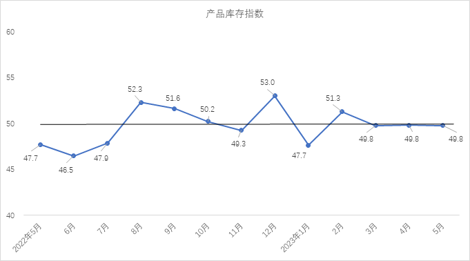 5月,產(chǎn)品庫存指數(shù)為49.8,與4月持平,產(chǎn)品庫存水平繼續(xù)維持前期。當(dāng)月,紡紗廠出庫相對樂觀,產(chǎn)品庫存尚可,基本控制在1個月以內(nèi),坯布庫存經(jīng)過消化有所下降。從構(gòu)成產(chǎn)品庫存指數(shù)的分項指標(biāo)看,紗庫存量指數(shù)為49.3,較4月下降0.4;布庫存量指數(shù)為50.5,較4月上升0.5。