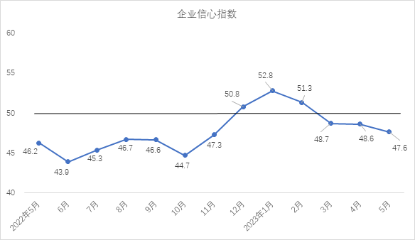 5月,企業(yè)信心指數(shù)為47.6,較4月下降1.0,延續(xù)下滑態(tài)勢。當(dāng)前,全球經(jīng)濟(jì)環(huán)境波動加劇,主要發(fā)達(dá)經(jīng)濟(jì)體政策收縮外溢效應(yīng)顯現(xiàn)。棉制紡織品及服裝外貿(mào)市場持續(xù)低迷,國內(nèi)消費市場恢復(fù)有待加強(qiáng),下游訂單延續(xù)性不足。隨著淡季來臨,企業(yè)對后市多持謹(jǐn)慎觀望態(tài)度,信心較前期有所下降。