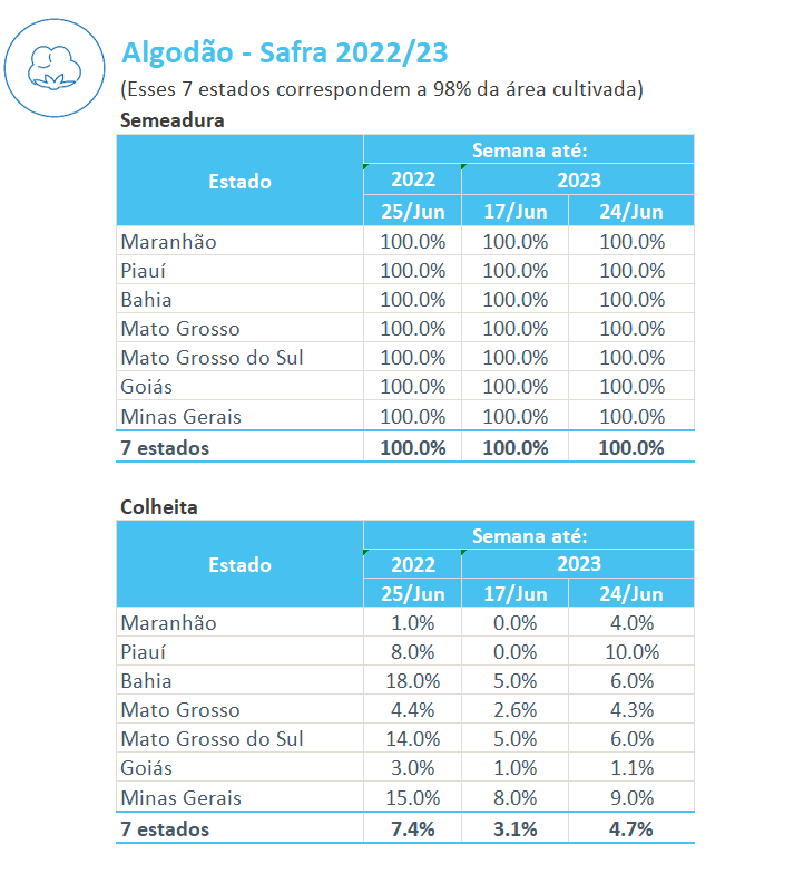 據(jù)巴西農(nóng)業(yè)部下屬的國家商品供應(yīng)公司CONAB,截至06月24日,巴西棉花收割率為4.7%,上周為3.1%,去年同期為7.4%。