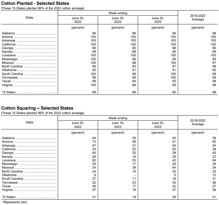 美國(guó)農(nóng)業(yè)部6月26日發(fā)布的美國(guó)棉花生長(zhǎng)報(bào)告顯示,截至6月25日當(dāng)周,美棉種植率為95%,前周為89%,去年同期為99%,五年均值為98%。美棉現(xiàn)蕾率為28%,前周為19%,去年同期為31%,五年均值為31%。美棉結(jié)鈴率為5%,前周為3%,去年同期為8%,五年均值為7%。美棉生長(zhǎng)優(yōu)良率為49%,前周為47%,去年同期為37%。