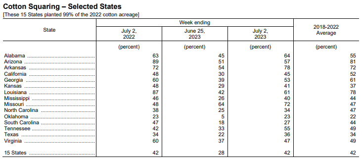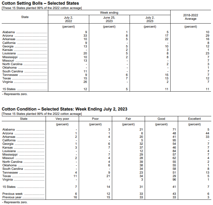 美國農(nóng)業(yè)部7月3日發(fā)布的美國棉花生長報(bào)告顯示,截至7月2日當(dāng)周,美棉現(xiàn)蕾率為42%,前周為28%,去年同期為42%,五年均值為42%。美棉結(jié)鈴率為11%,前周為5%,去年同期為12%,五年均值為11%。美棉生長優(yōu)良率為48%,前周為49%,去年同期為36%。