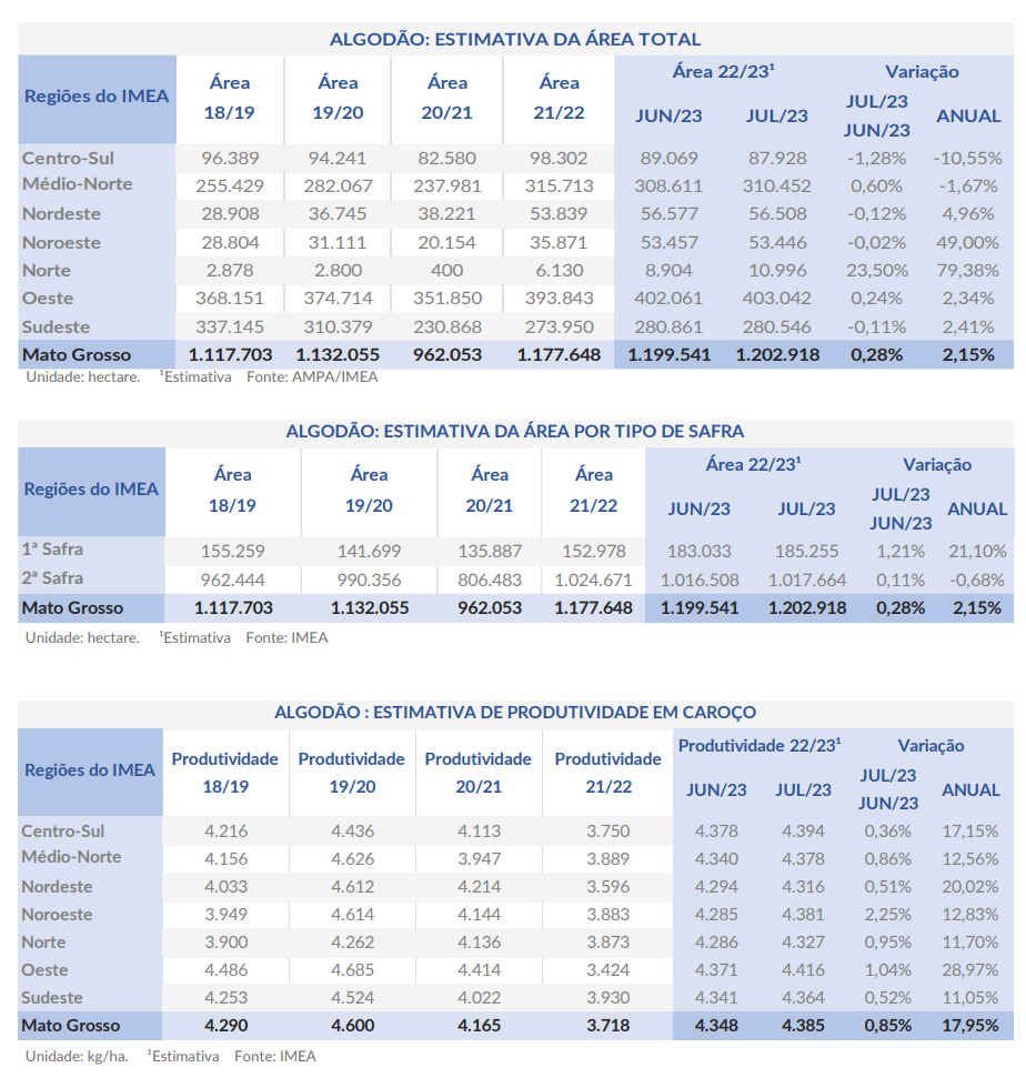巴西馬托格羅索州農(nóng)業(yè)經(jīng)濟廳(IMEA)公布的月報顯示,該州2022/23年度棉花種植面積預(yù)期為120.29萬公頃,較上月預(yù)測的119.95萬公頃增加0.28%,較上年預(yù)測的117.76萬公頃增加2.15%;單產(chǎn)預(yù)期為4385.0千克/公頃,較上月預(yù)測的4348.0千克/公頃增加0.85%,較上年預(yù)測的3718.0千克/公頃增加17.95%;產(chǎn)量預(yù)期為527.51萬噸,較上月預(yù)測的521.62萬噸增加1.13%,較上年預(yù)測的437.84萬噸增加20.48%。