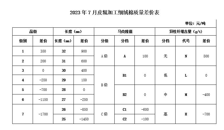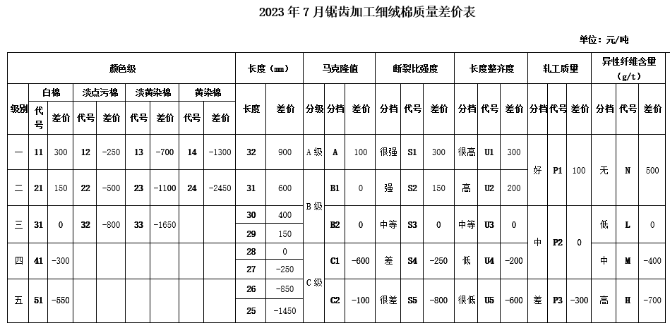 根據(jù)《中國棉花協(xié)會(huì)國產(chǎn)棉質(zhì)量差價(jià)表管理辦法》規(guī)定,現(xiàn)正式發(fā)布2023年7月《鋸齒加工細(xì)絨棉質(zhì)量差價(jià)表》、《皮輥加工細(xì)絨棉質(zhì)量差價(jià)表》和《長絨棉質(zhì)量差價(jià)表》(單位:元/噸)。