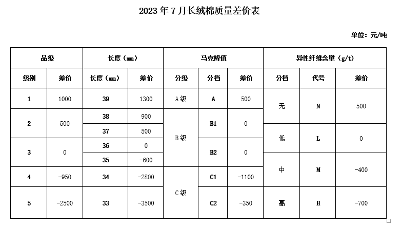 依據(jù)2023年6月的棉花公檢質(zhì)量數(shù)據(jù)、中國棉花協(xié)會(huì)棉花質(zhì)量?jī)r(jià)差自動(dòng)生成系統(tǒng)采集的棉花加工企業(yè)銷售成交價(jià)、紡織企業(yè)監(jiān)測(cè)點(diǎn)的采集數(shù)據(jù)及當(dāng)月的中國棉花價(jià)格指數(shù),并征求業(yè)內(nèi)相關(guān)專家的意見,與上月相比,2023年7月《中國棉花協(xié)會(huì)國產(chǎn)棉質(zhì)量差價(jià)表》做如下調(diào)整: