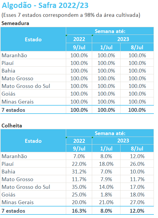 據(jù)巴西農(nóng)業(yè)部下屬的國(guó)家商品供應(yīng)公司CONAB,截至7月8日,巴西棉花收割率為12%,上周為8%,去年同期為16.3%。