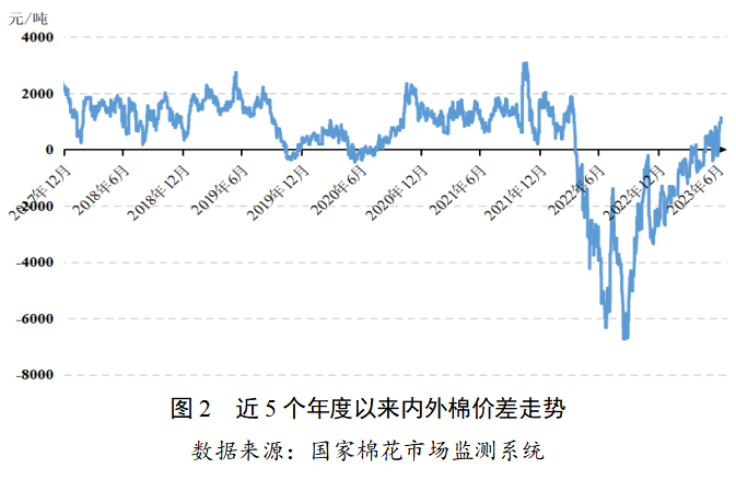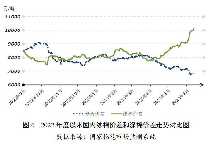 6月中旬以來(lái),受?chē)?guó)際棉價(jià)有所上漲、人民幣貶值等因素影響,內(nèi)外棉價(jià)差有所收窄。截至2023年7月10日,內(nèi)外棉價(jià)差989元/噸,較6月中旬收窄643元/噸?,F(xiàn)階段下游企業(yè)采購(gòu)進(jìn)口棉利潤(rùn)收縮。
