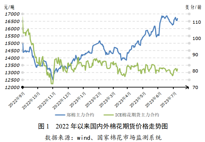 2023年6月中旬以來(lái),全球消費(fèi)持續(xù)低迷,市場(chǎng)對(duì)新年度棉花減產(chǎn)炒作降溫,國(guó)內(nèi)紡織市場(chǎng)整體步入淡季,但受產(chǎn)業(yè)鏈情緒普遍樂(lè)觀支撐,棉價(jià)盤(pán)整為主。7月美聯(lián)儲(chǔ)恢復(fù)加息概率上升,北半球棉花生長(zhǎng)也進(jìn)入關(guān)鍵期,下一步棉花行情走勢(shì)如何,本期月報(bào)將進(jìn)行探討。