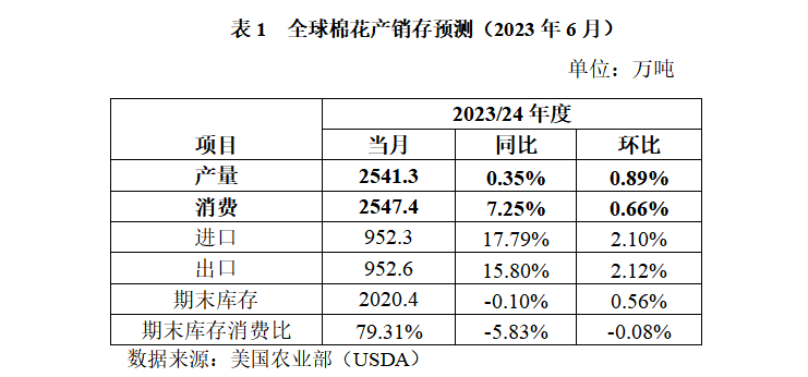 據(jù)美國(guó)農(nóng)業(yè)部6月預(yù)測(cè),2023年度全球棉花產(chǎn)量2541萬(wàn)噸,同比增長(zhǎng)0.35%,較上月調(diào)增0.89%;全球棉花消費(fèi)量2547萬(wàn)噸,同比增長(zhǎng)7.25%,較上月調(diào)增0.66%;產(chǎn)需缺口由上月的12萬(wàn)噸收窄至6萬(wàn)噸;全球期末庫(kù)存消費(fèi)比79.39%,同比下降5.83個(gè)百分點(diǎn),較上月下降0.08個(gè)百分點(diǎn)。