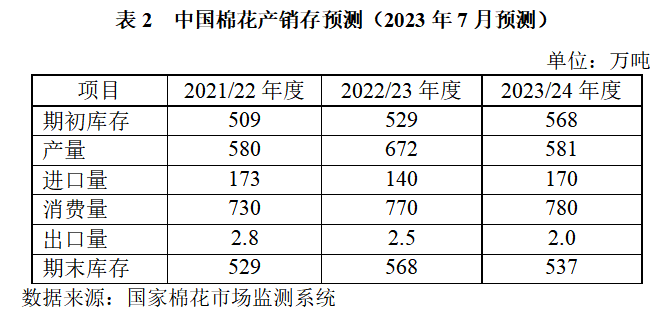 2023年度中國(guó)棉花期初庫(kù)存568萬(wàn)噸,較上期預(yù)測(cè)值下調(diào)50萬(wàn)噸,同比增長(zhǎng)7.5%;產(chǎn)量581萬(wàn)噸,較上期預(yù)測(cè)值下調(diào)36萬(wàn)噸,同比下降13.5%;進(jìn)口量170萬(wàn)噸,較上期預(yù)測(cè)值持平,同比增長(zhǎng)21.4%;消費(fèi)量780萬(wàn)噸,較上期預(yù)測(cè)值持平,同比增長(zhǎng)1.3%;出口量2萬(wàn)噸,較上期預(yù)測(cè)值持平,同比下降20.0%;期末庫(kù)存537萬(wàn)噸,較上期預(yù)測(cè)值下調(diào)86萬(wàn)噸,同比下降5.4%;庫(kù)存消費(fèi)比為68.73%,較上年下降4.82個(gè)百分點(diǎn)。