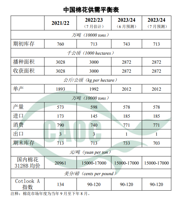 本月估計,2022/23年度,下游紡織廠訂單不足,出口下行壓力明顯,原料需求疲弱,消費量下調(diào)10萬噸至740萬噸。受消費下降等因素影響,本年度棉花進口下降超出預(yù)期,本月將棉花進口量下調(diào)40萬噸至145萬噸。至6月末,新疆棉區(qū)大部棉花處現(xiàn)蕾至開花期,黃河流域和長江流域大部處第五真葉至現(xiàn)蕾期,棉花長勢總體良好。部分棉區(qū)出現(xiàn)高溫天氣,對棉花現(xiàn)蕾開花產(chǎn)生一定影響。本月對2023/24年度中國棉花產(chǎn)量、消費量和進口量預(yù)測數(shù)據(jù)維持上月不變,期初庫存和期末庫存相應(yīng)調(diào)整。