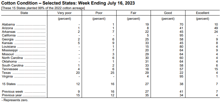 美國(guó)農(nóng)業(yè)部7月17日發(fā)布的美國(guó)棉花生長(zhǎng)報(bào)告顯示,截至7月16日當(dāng)周,美棉現(xiàn)蕾率為64%,前周為55%,去年同期為72%,五年均值為69%。美棉結(jié)鈴率為25%,前周為17%,去年同期為30%,五年均值為26%。美棉生長(zhǎng)優(yōu)良率為45%,前周為48%,去年同期為38%。